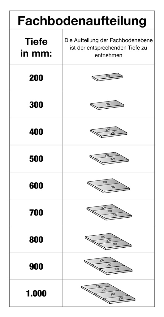 Die Traglastwerte gelten bei gleichmäßiger Lastverteilung auf dem Fachboden. Zusätzliche Ebenen sind bei Einhaltung der angegebenen max. Feldlast möglich.